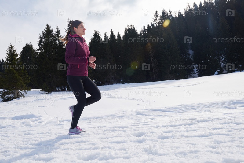 Молодая женщина бегает на улице по снегу в лесу