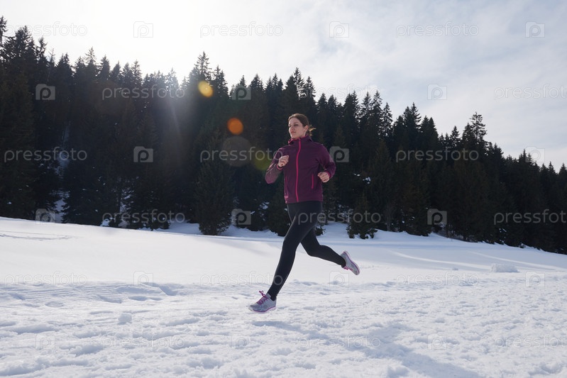 Молодая женщина бегает на улице по снегу в лесу
