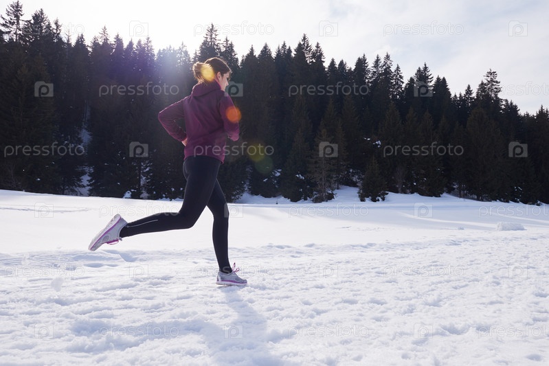 Молодая женщина бегает на улице по снегу в лесу