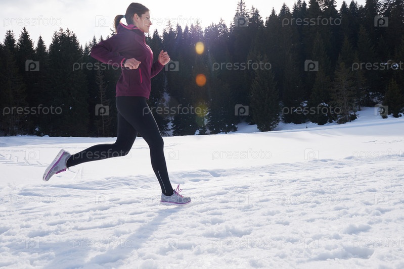 Молодая женщина бегает на улице по снегу в лесу