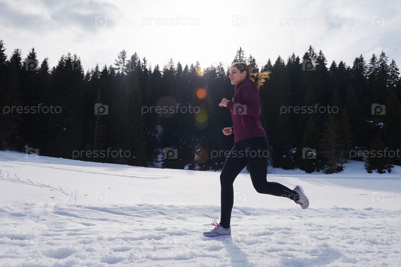 Молодая женщина бегает на улице по снегу в лесу
