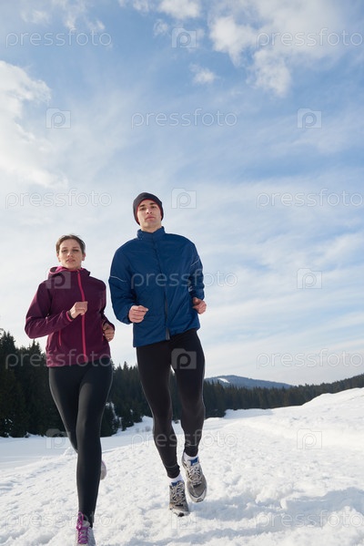 Пара бегает на улице по снегу