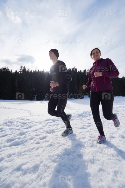 Пара бегает на улице по снегу