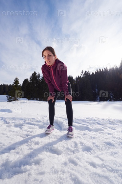 Молодая женщина бегает на улице по снегу в лесу