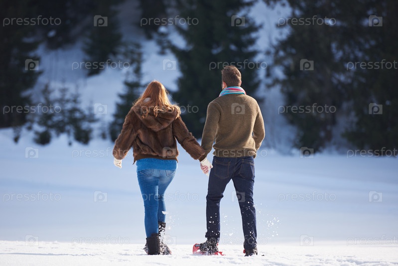 Пара развлекается и ходит в снежных ботинках