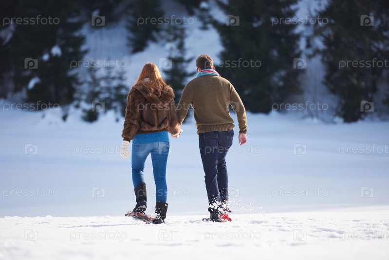 Пара развлекается и ходит в снежных ботинках