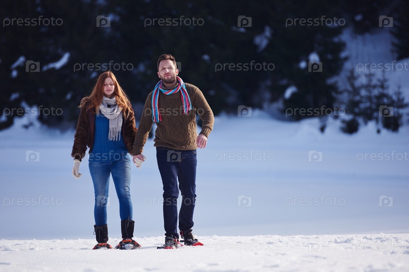 Пара развлекается и ходит в снежных ботинках