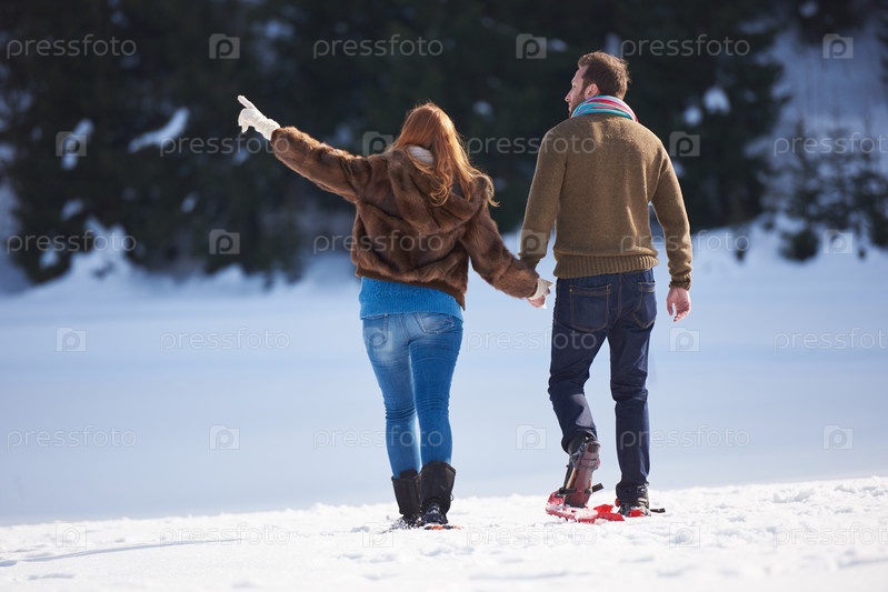 Пара развлекается и ходит в снежных ботинках