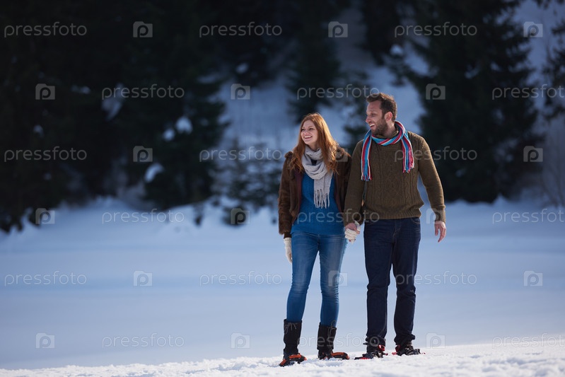 Пара развлекается и ходит в снежных ботинках