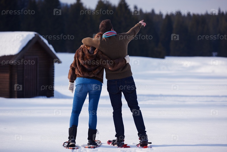 Пара развлекается и ходит в снежных ботинках