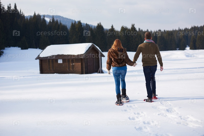 Пара развлекается и ходит в снежных ботинках