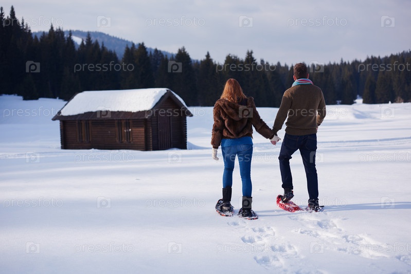Пара развлекается и ходит в снежных ботинках