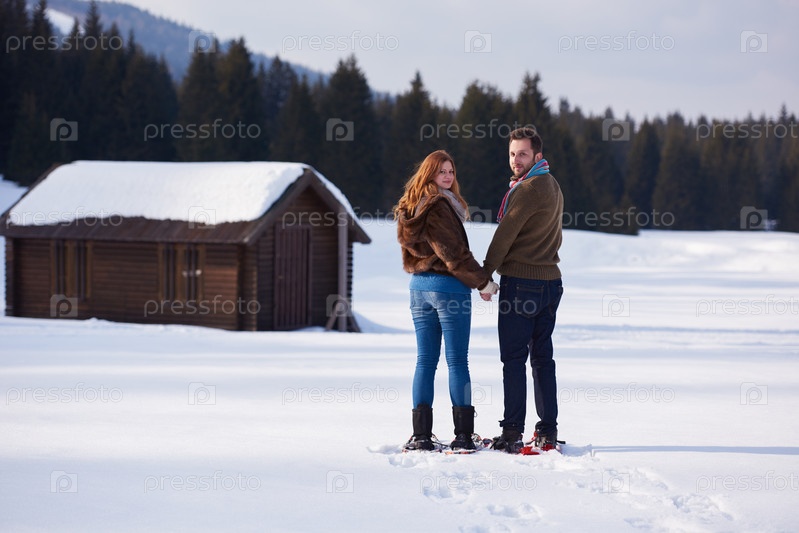 Пара развлекается и ходит в снежных ботинках