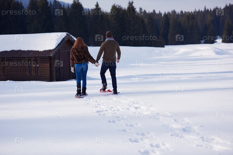 Пара развлекается и ходит в снежных ботинках