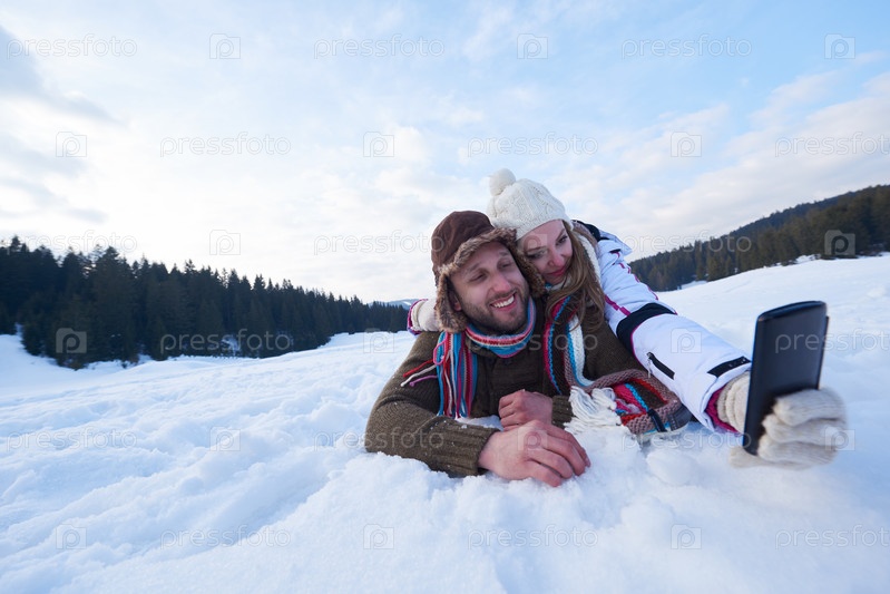 Романтическая пара развлекается в свежем снегу и делает селфи