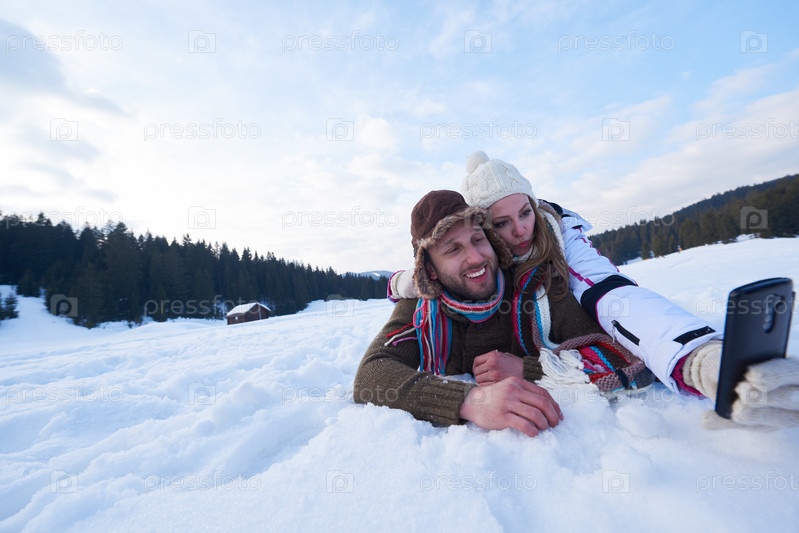 Романтическая пара развлекается в свежем снегу и делает селфи