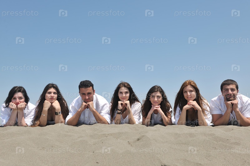 Группа счастливых молодых людей в веселитесь на пляже
