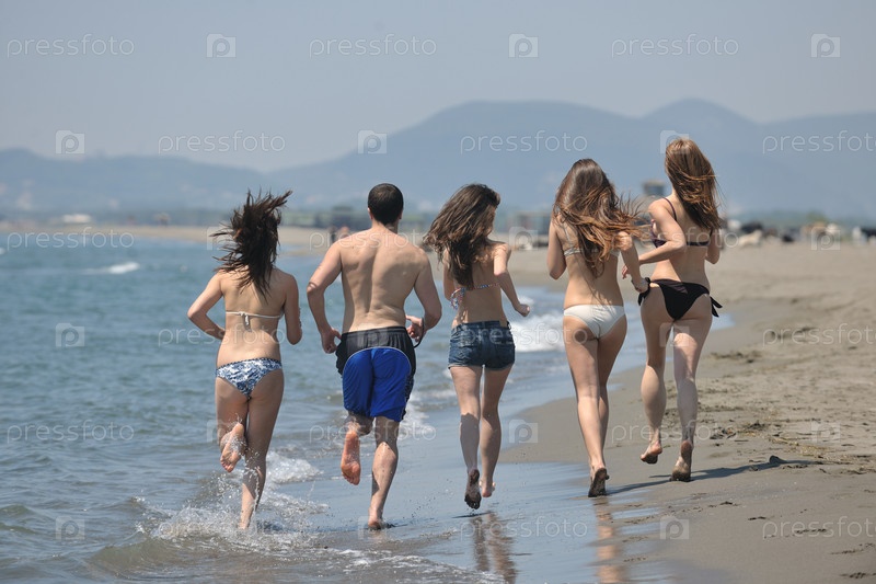 Группа счастливых людей весело проводит время и бегает по пляжу
