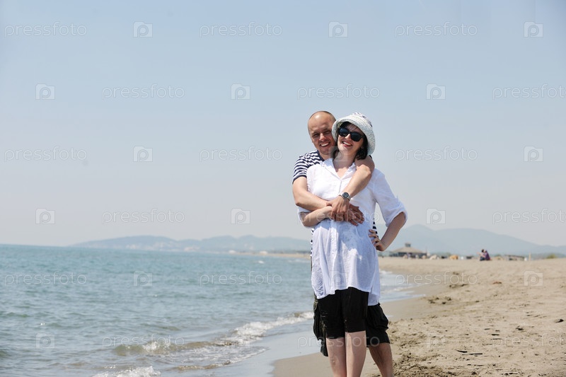 Счастливая молодая пара развлекается на пляже