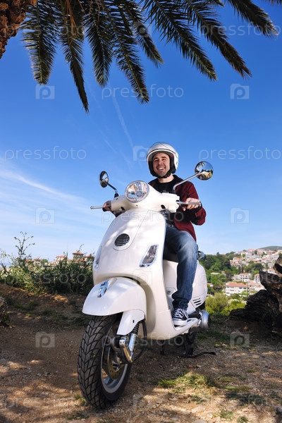 Портрет счастливой молодой пары любви на скутере, наслаждающейся летним временем