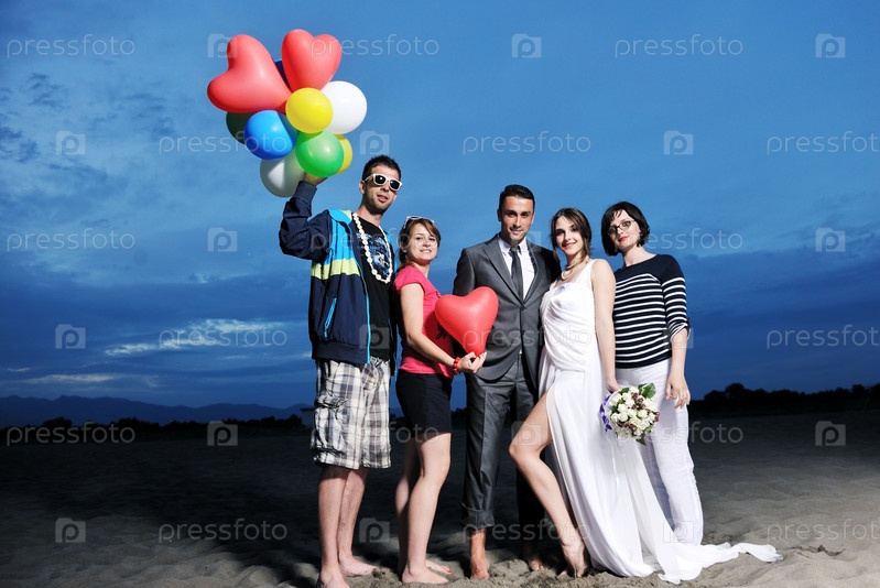 Счастливая группа молодых людей весело проводит время на пляже