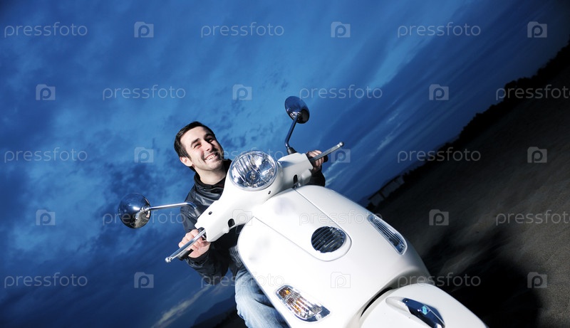 Молодой человек ездит на ретро-скутере