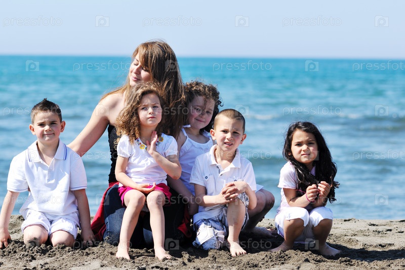 Групповой портрет детей с учителем на пляже