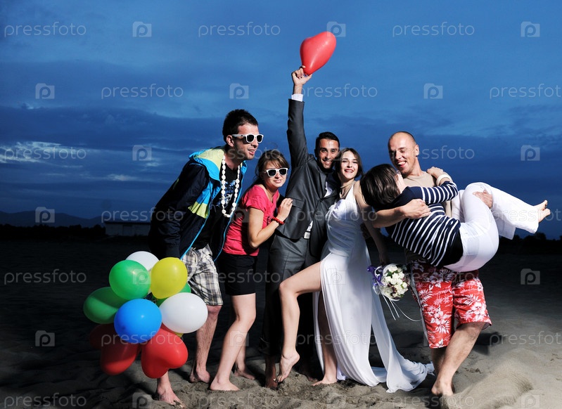 Счастливая группа молодых людей весело проводит время на пляже
