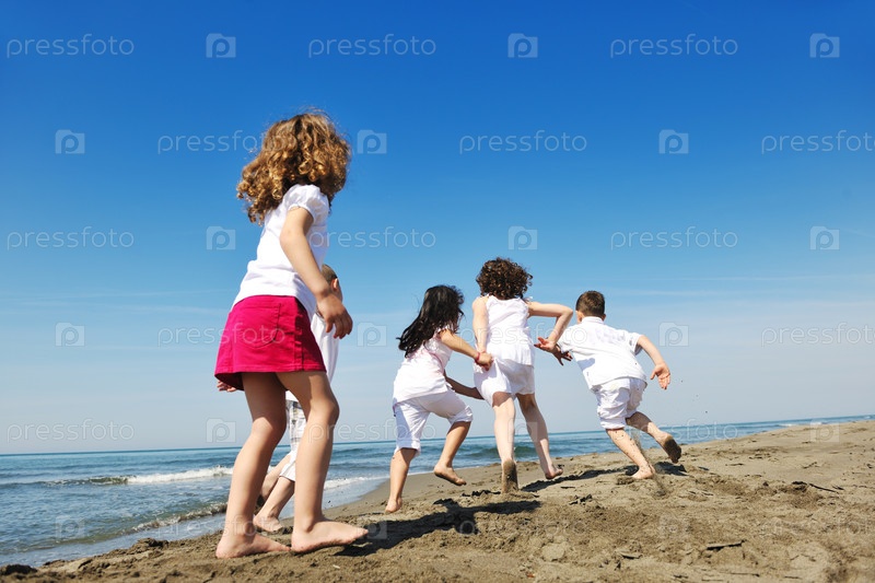 Счастливая группа молодых людей весело проводит время на пляже