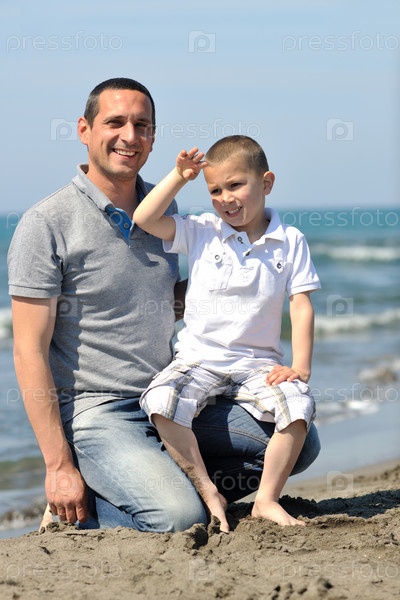 Счастливый отец и сын веселятся и наслаждаются временем на пляже