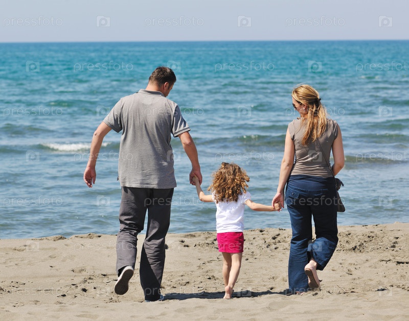 Счастливая молодая семья развлекается на пляже