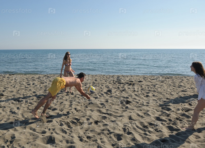Молодежная группа развлекается и играет в пляжный волейбол