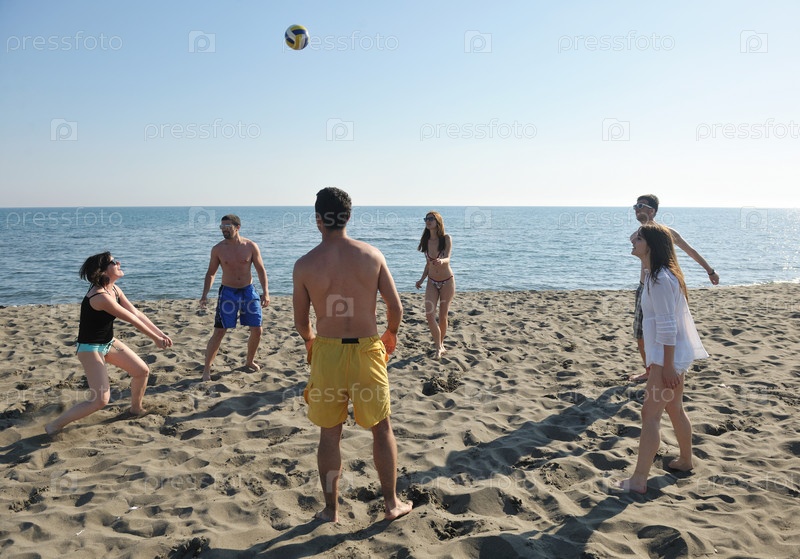 Молодежная группа развлекается и играет в пляжный волейбол