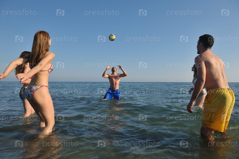 Молодежная группа развлекается и играет в пляжный волейбол