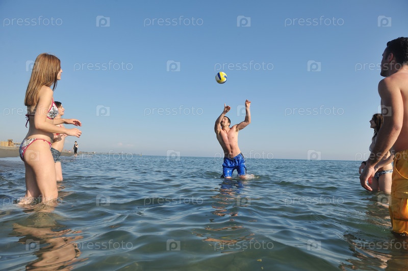 Молодежная группа развлекается и играет в пляжный волейбол