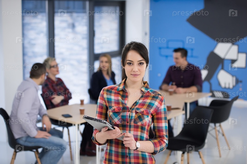 Портрет молодой деловой женщины в офисе с командой на заднем плане