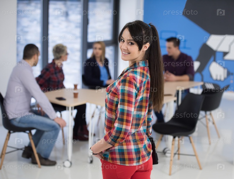 Портрет молодой деловой женщины в офисе с командой на заднем плане