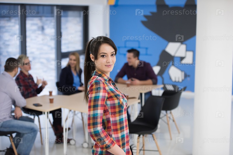 Портрет молодой деловой женщины в офисе с командой на заднем плане
