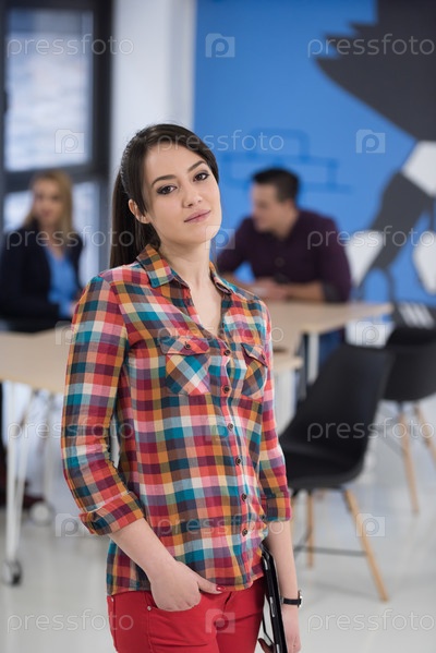 Портрет молодой деловой женщины в офисе с командой на заднем плане