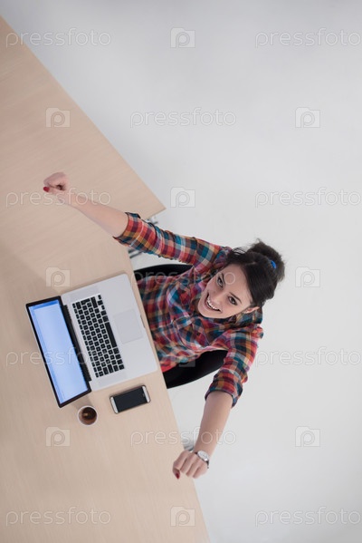 Вид сверху молодой деловой женщины, работающей на ноутбуке