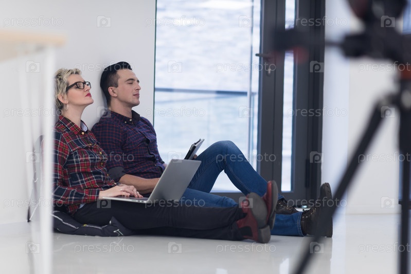 Стартап-бизнес, пара работает на ноутбуке в офисе