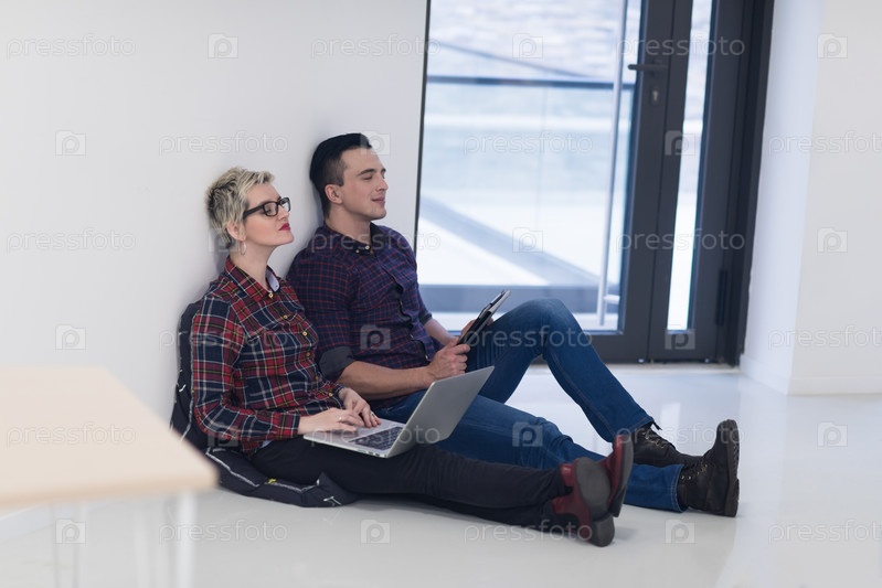 Стартап-бизнес, пара работает на ноутбуке в офисе