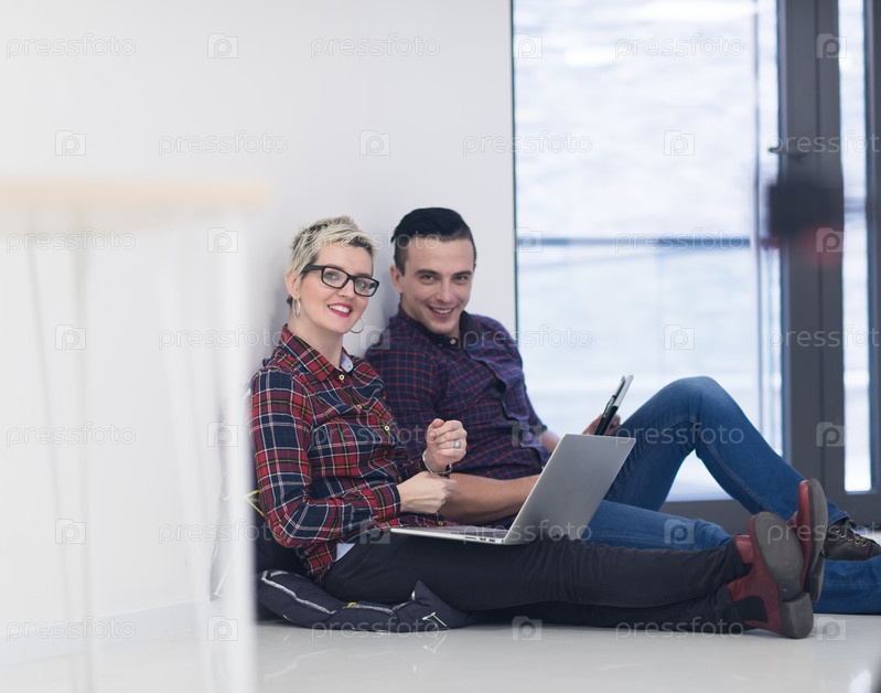 Стартап-бизнес, пара работает на ноутбуке в офисе