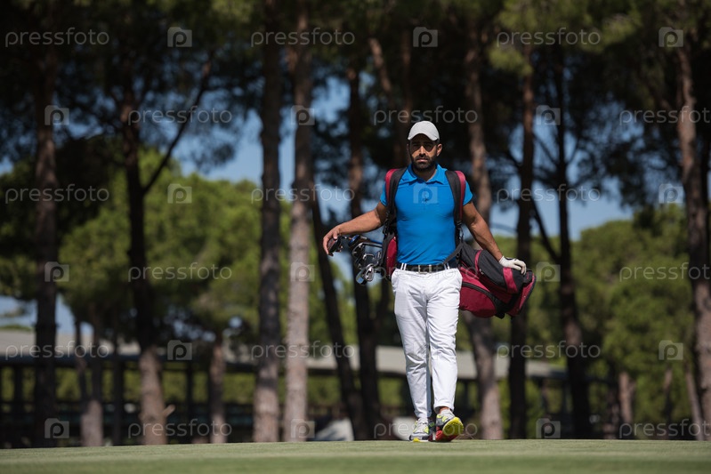 Игрок в гольф ходит и несет сумку