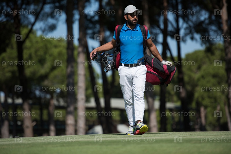 Игрок в гольф ходит и несет сумку