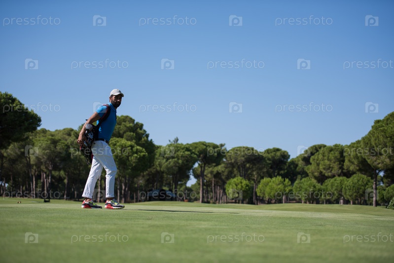 Игрок в гольф ходит и несет сумку