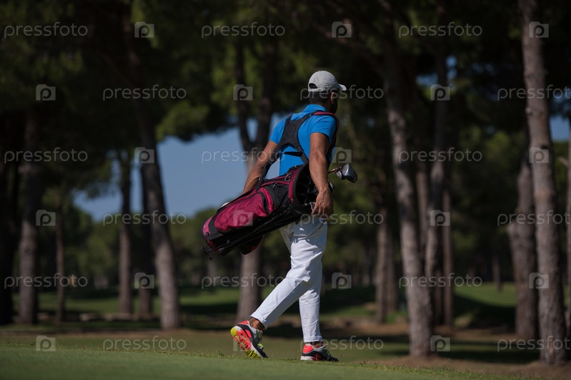 Игрок в гольф ходит и несет сумку