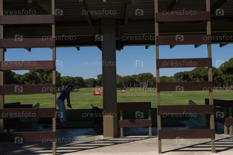 Игрок в гольф, практикующий выстрел на тренировке