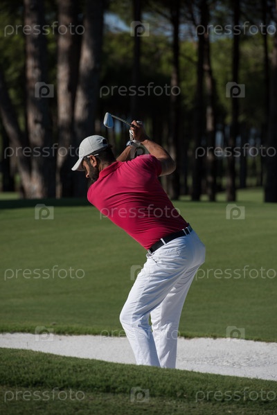 Игрок по гольфу бьет выстрел из песчаного бункера