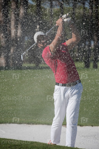 Игрок по гольфу бьет выстрел из песчаного бункера